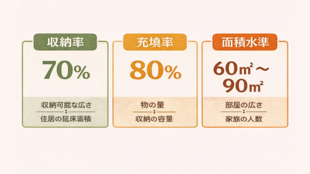 - 収納率:住宅の床面積に対する収納面積の割合。マンションは8〜10%程度が目安と言われます。