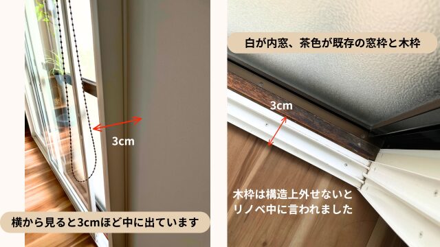 ただし、既存窓の金物やレール等と干渉する関係で、内窓は室内側に“持ち出して”設置されています。