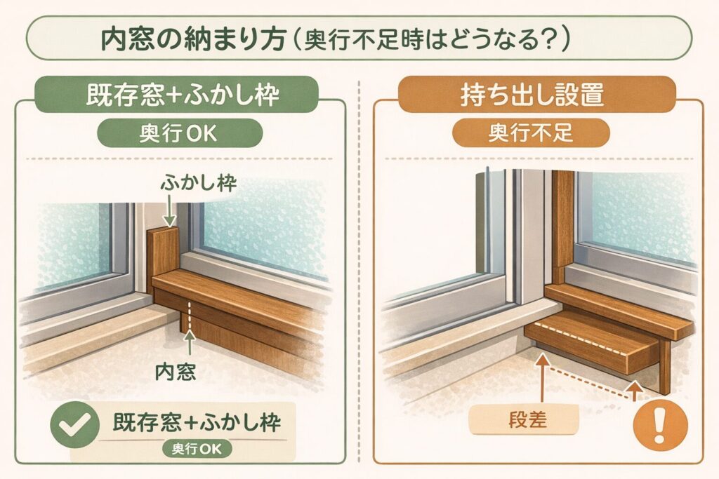 確認2)窓枠の奥行:足りないと“ふかし枠”や“持ち出し設置”になる